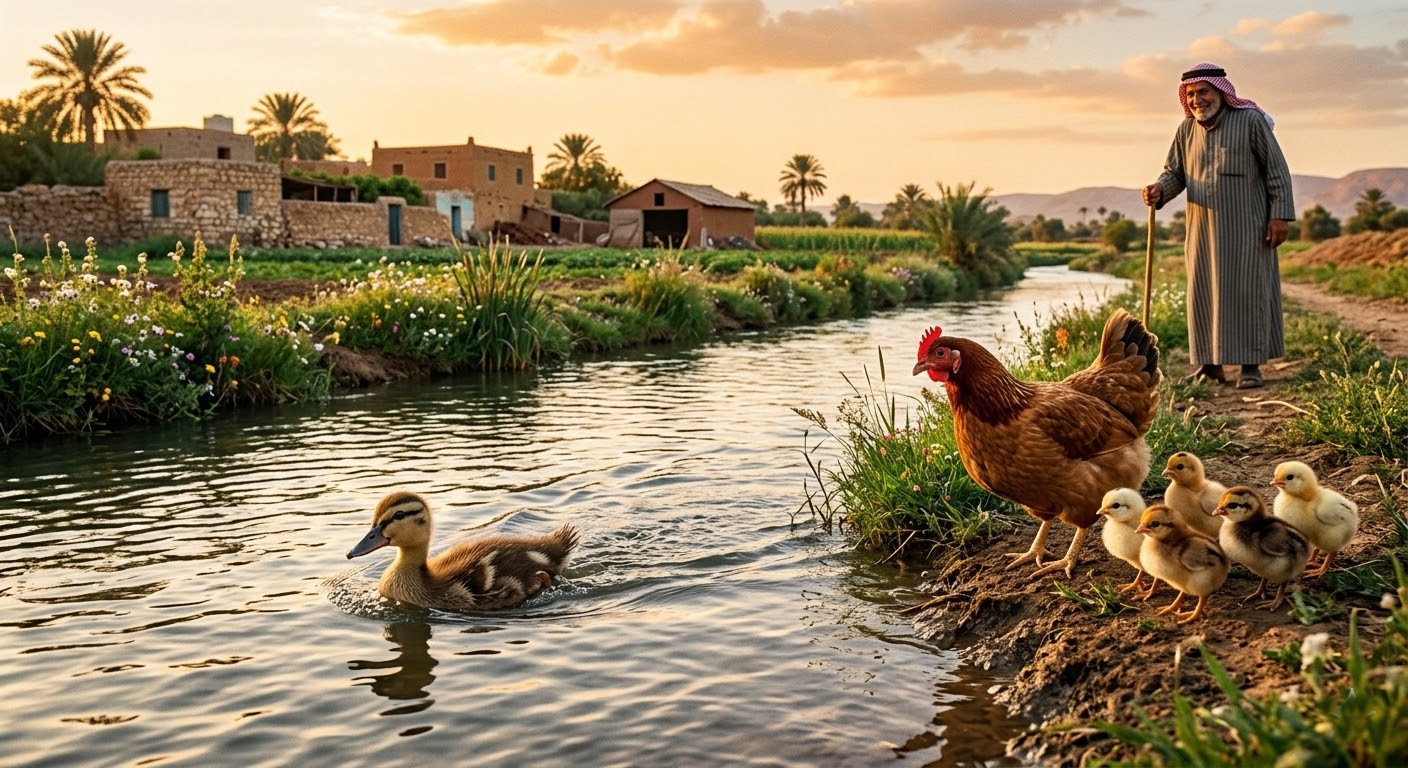 قصة هذا المثل تعود إلى إحدى المزارع، فقد كان هنالك مُزارع يملك مزرعة صغيرة في إحدى القرى، يقومُ بتربية بعض الحيوانات فيها، ومن بينها كانت هنالك بطة وقد وضعت بيضة صغيرة، ومن ثم ماتت البطة، فقام المُزارع بوضع تلك البيضة تحت إحدى الدجاجات، وتم تفقيس البيوض، وبقيت البطة الصغيرة، تنمو مع صغار الدجاج، وفي يوم من الأيام، عند مرور الدجاجة الأم مع صغارها بالقرب من النهر، قفزت البطة الصغيرة إلى المياه، وبدأت بالسباحة بمهارة، دون اي تعليم مسبق، وقد كان المُزارع يراقب ما يحدث عن بعد فقال جملته المشهورة: “فرخ البط عوام”.