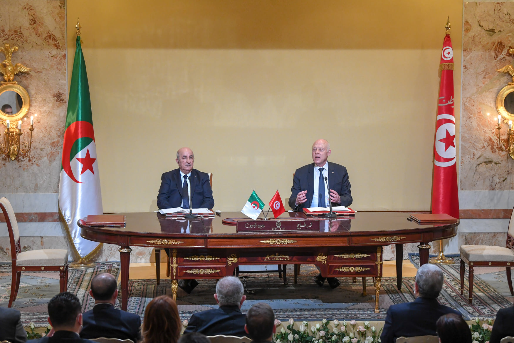 أشرف رئيس الجمهورية قيس سعيد مساء اليوم الأربعاء 15 ديسمبر 2021 بقصر قرطاج، بمعية الرئيس  الجزائري عبد المجيد تبون، على مراسم توقيع 27 اتفاقية ومذكرة تفاهم بين البلدين.