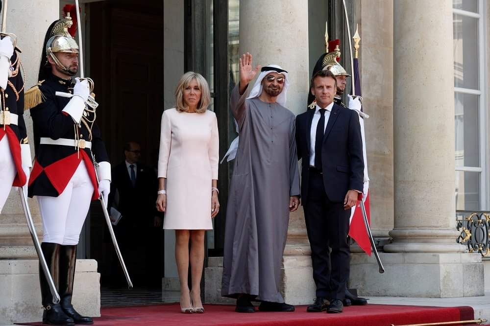 وكان ماكرون وزوجته بريجيت في استقبال الشيخ محمد بن زايد عند مدخل القصر.