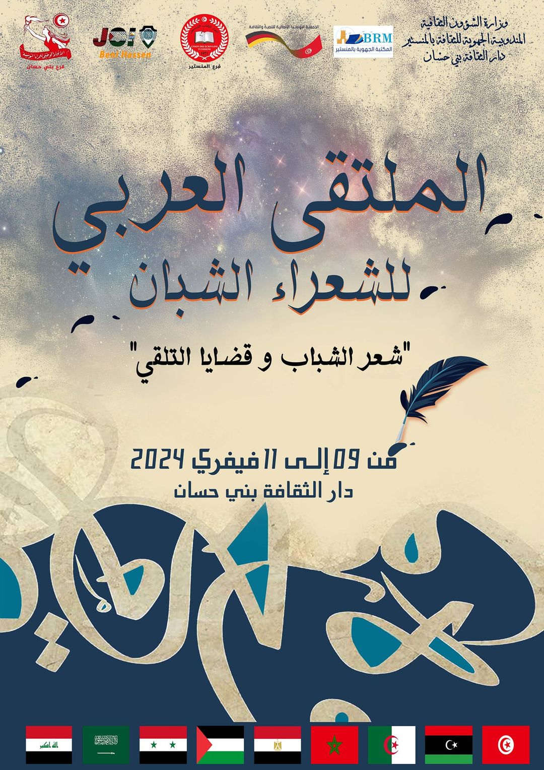 تحت إشراف المندوبية الجهوية للشؤون الثقافية بالمنستير، تنظم دار الثقافة بني حسّان الدورة السابعة عشرة من الملتقى العربي للشعراء الشبان وذلك من 9 إلى 11 فيفري 2024 تحت عنوان “شعر الشباب وقضايا التلقي”.