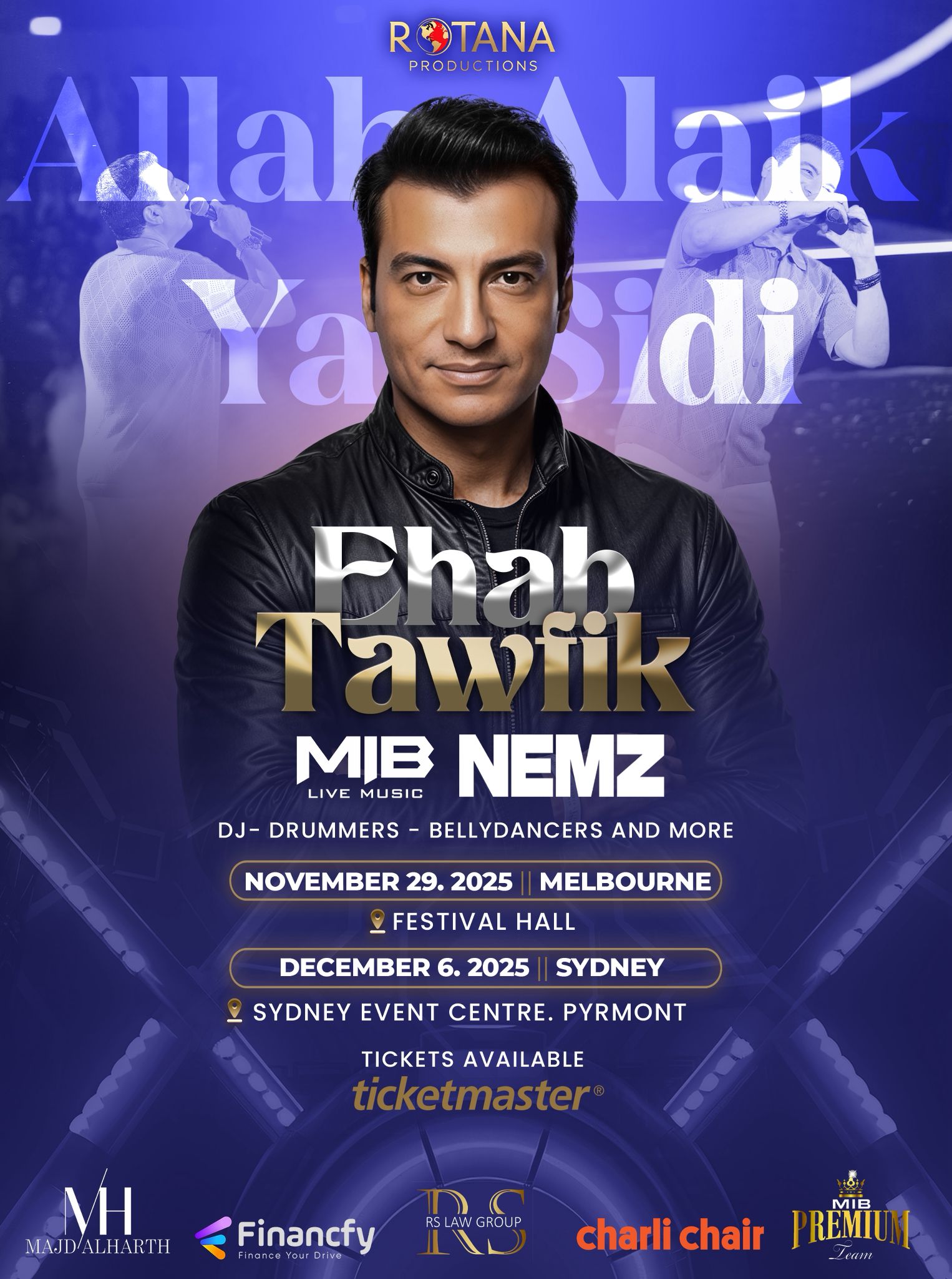 ومن المقرر أن يكون الحفل الأول في مدينة ملبورن يوم 29 نوفمبر 2025، يليه الحفل الثاني في سيدني بتاريخ 6 ديسمبر 2025، حيث تنظم الحدث شركة روتانا برودكشنز، المتخصصة في تنظيم الحفلات الفنية للجاليات العربية والمصرية في أستراليا وأوروبا.