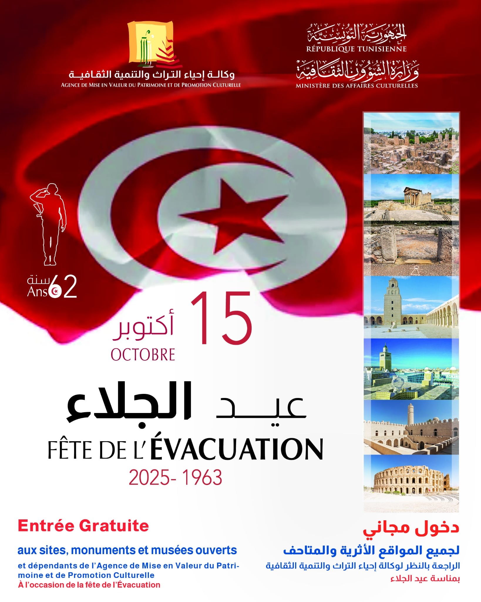 أعلنت وكالة إحياء التّراث والتّنمية الثّقافية أنّ الدخول إلى جميع المواقع الأثريّة والمعالم التاريخيّة والمتاحف المفتوحة والتابعة لها سيكون مجانًا يوم الأربعاء 15 أكتوبر 2025، وذلك في إطار سياسة تقريب الثقافة من المواطنين وإتاحة الفرصة للجميع لاكتشاف التراث الوطني.
