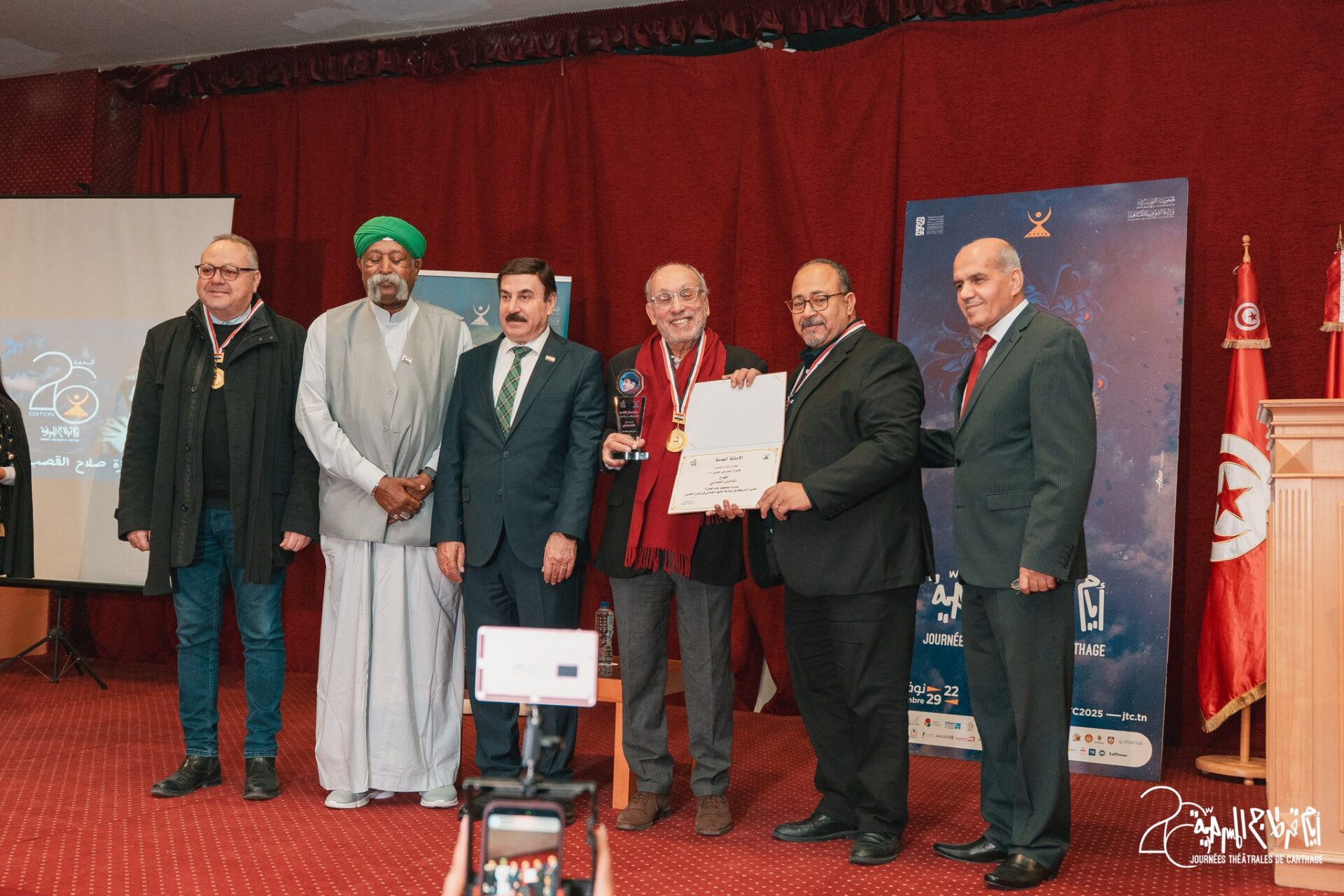 هذا التتويج لم يكن مجرد تكريم، بل شكل لحظة رمزية تستحضر أثر الجعايبي منذ بداياته في مسرح الجنوب بقفصة، مرورًا بتجربته اللامعة مع رواد المسرح التونسي مثل فاضل الجزيري، جليلة بكار، ومحمد إدريس، وصولًا إلى آخر أعماله “(ال) حلم…كوميديا سوداء” التي شهدت حضورها خلال افتتاح الدورة الحالية.