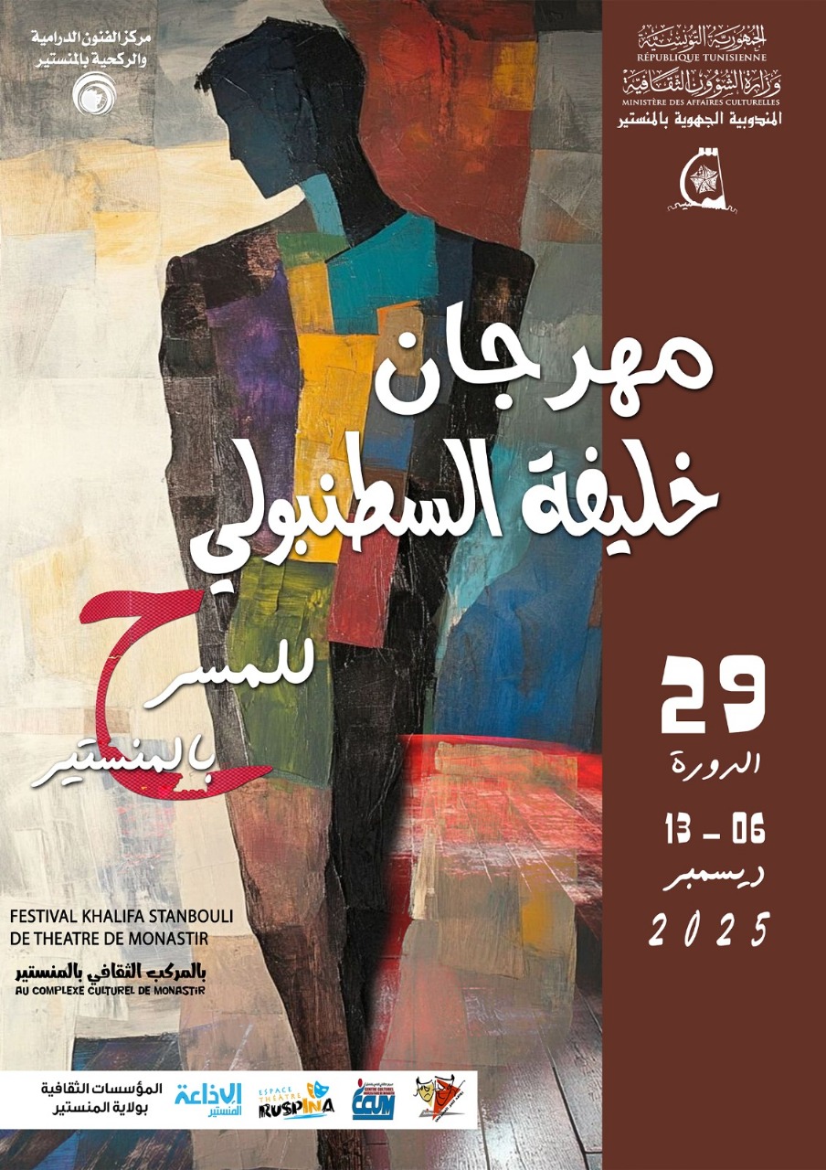تحت إشراف وزارة الشؤون الثقافية، تنظم المندوبية الجهوية بالتعاون مع مركز الفنون الدرامية والركحية بالمنستير فعاليات الدورة التاسعة والعشرين لمهرجان “خليفة السطنبولي للمسرح”، وذلك من 06 إلى 13 ديسمبر 2025.