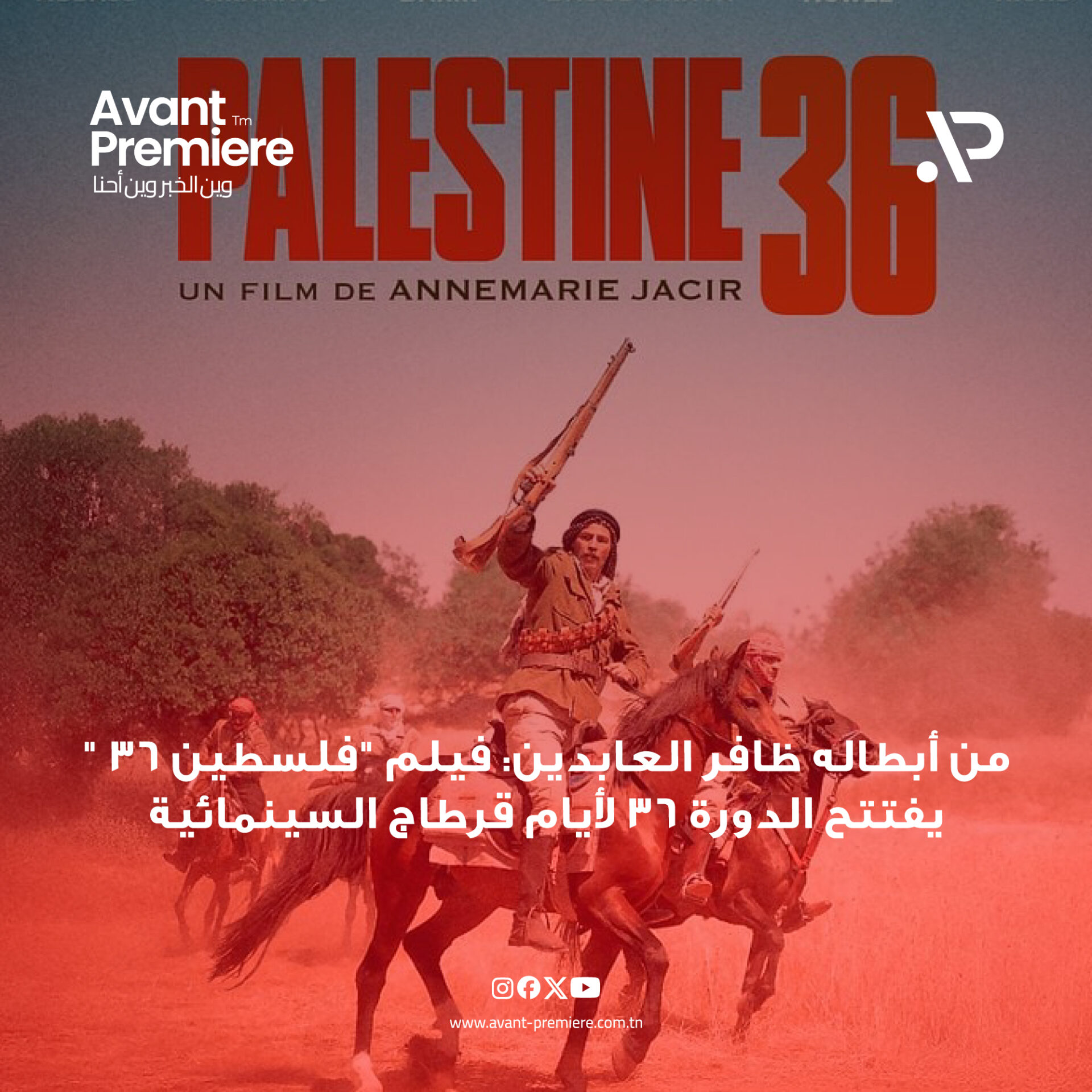 يفتتح فيلم “فلسطين 36” للمخرجة آن ماري جاسر الدورة السادسة والثلاثين لأيام قرطاج السينمائية السبت 13 ديسمبر 2025. هذا العمل السينمائي من إنتاج 2025 ويجسد أدواره كامل الباشا، هيام عباس، ياسمين المصري، صالح بكري، كريم داود عناية، ظافر العابدين والممثلين العالميين وليام كانينغهام وجيريمي آيرونز، ومن كتابة مخرجته آن ماري جاسر.