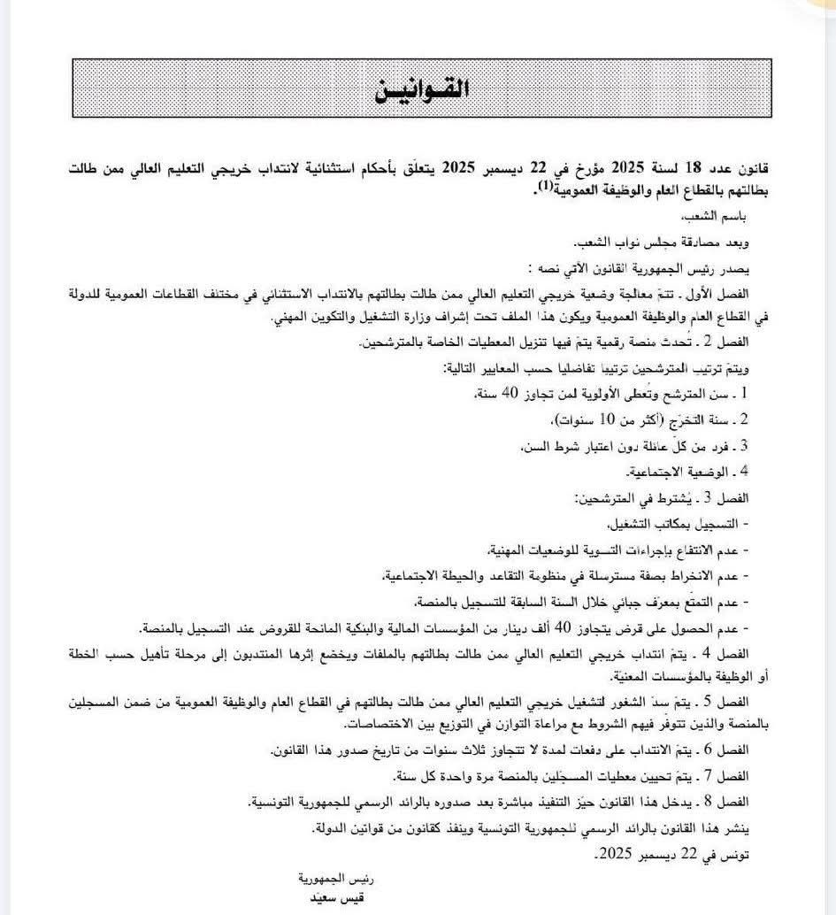 صدر اليوم الثلاثاء 23 ديسمبر 2025 بالرائد الرسمي للجمهورية التونسية القانون عدد 18 لسنة 2025 المؤرخ في 22 ديسمبر 2025، والمتعلق بأحكام استثنائية لانتداب خريجي التعليم العالي ممن طالت بطالتهم بالقطاع العام والوظيفة العمومية.