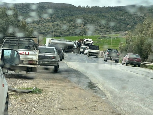 جد مساء اليوم الاثنين 26 / 01 / 2026 بالطريق الوطنية رقم 6 وتحديدا على مستوى منطقة وادي الزرقاء حادث اصطدام بين شاحنة محملة بالخشب وأخرى مخصصة لنقل الحليب . وقد سارعت وحدات الحماية المدنية وحرس المرور بباجة للتدخل وإعادة تنظيم حركة المرور التي تعطلت بصفة جزئية إثر الحادث