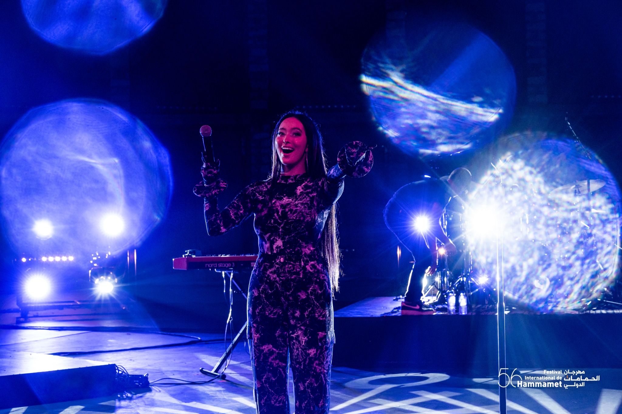 يسرا منصور التي تواصلت مع الجمهور بعد كل أغنية وأعربت عن سعادتها الكبرى بوجودها في الحمامات واضافت ان هذه الزيارة لتونس هي الثانية لمجموعة “باب البلوز” ولا تحمل عنها سوى  الذكريات الحلوة التي لا تنسى.