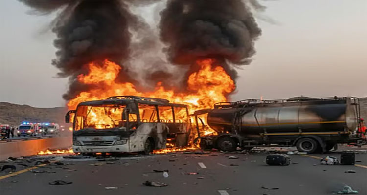 Medina, November 17, 2025 — A tragic accident in Medina early Monday morning claimed the lives of dozens of Indian Umrah pilgrims after their bus collided with an oil tanker.